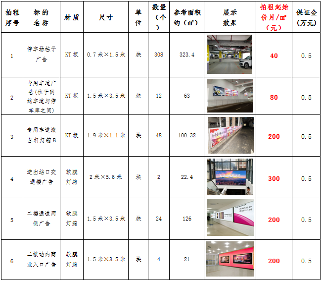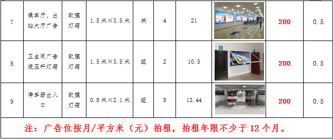 (六)拍租鎮(zhèn)雄縣開(kāi)元商業(yè)物業(yè)服務(wù)有限公司以勒高鐵站站前廣場(chǎng)各類廣告位使用權(quán),廣告位分布、類型、規(guī)格及展示效果如下: